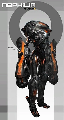Nephilim are bipedal robots built for military use. They are a variant of the Valet Robot[1], designed to engage in hostile situations and crowds. They feature a spherical shield that acts as a land mine when detonated, the tops of their heads reminiscent of a trigger of a detonator.[8][9]